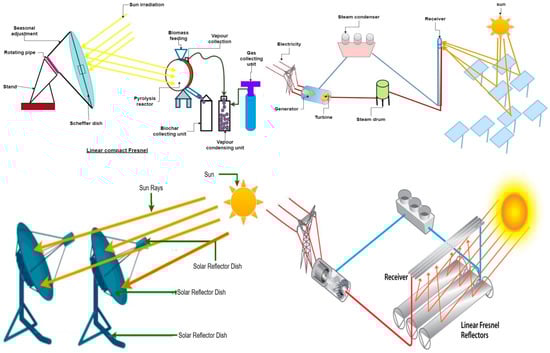 Figure 5 displays various optical concentrating devices. Moreover, elliptical reflectors, also known as mirrors (an image-free visualization), parabolic mirrors with a deep dish, and lamp reflectors have been used by researchers utilizing light simulators in solar–biomass pyrolysis through the reactor window to focus the radiation beam [,]. Studies reveal that the number of these concentrators may be increased for a single operation to reach the required temperature, typically 300–900 °C []. Effective installation setup is essential for the breakdown of biomass for effective liquid accumulation, regardless of the kind of concentrating equipment used [].