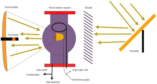 Many designs for solar pyrolysis have opted for a vertical reactor orientation, most likely to facilitate the simple collecting and sweeping of the liquid with the help of gravity []. To conduct the pyrolysis of tomato waste and agave leaves for solar biomass [], Mexico used a vertically positioned, borosilicate fixed reactor with a spherical shape. Figure 6 illustrates the thermal–biomass system and the system’s orientation []. The solar concentrator furnace, which has a concentration area of 8 cm in diameter and is horizontally positioned with a temperature range of 450–1550 °C and a capacity of 25 kW, is directed by the heliostat towards the reactor assembly, situated 3.68 m away [,]. The installation’s position allowed the biomass to be directly exposed to radiation. Argon gas maintained inert conditions and cleaned the reactor walls []. The design aims to increase the amount of biochar produced and describe its physiochemical properties at different heating speeds for one to two hours [].