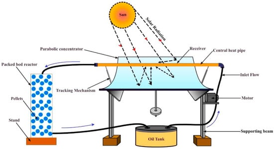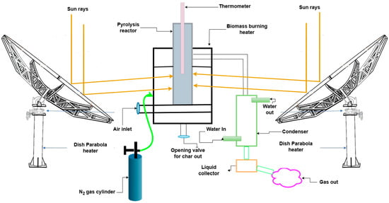 Schematic diagram of the solar–biomass pyrolysis system for the production of biofuels [,].