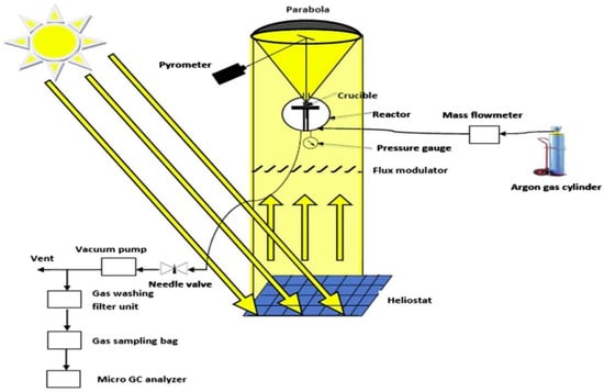 Nonetheless, the reactor’s direct radiation was made possible by the placement of the two orientations. High heating rates and final temperatures promote the formation of syngas and the breakdown of tar, according to the results of the influence of lignocellulose content on the product distribution of forestry products, absolute temperature, and heating rate. Using pine sawdust, they produced 63.5 wt% of gas at 50 °C/s and 1200 °C []. Ref. [] used the same reactor setup orientation for their different study goals when they pyrolyzed beech wood. The thermal–solar system’s sun-ray-monitoring sensor automatically focuses the heliostats to direct light onto the parabolic mirror that faces down onto the reactor based on the sun’s location []. Ref. [] reported a 62% gas yield at a lower heating value of 10,376 ± 218 (kJ/kg of wood), with argon flow rates of 12 NL/min, 50 °C/s, 0.85 bar, and 1200 °C, respectively, as well as temperature, heating rate, and pressure. The range of biomass energy upgrading was 38–53% []. Ref. [] provided a schematic representation of a hybrid solar–biomass pyrolysis of date palms using a vertical steel reactor (nitrogen gas was used to provide the inert environment) that was partially heated by a biomass heater (Figure 7).