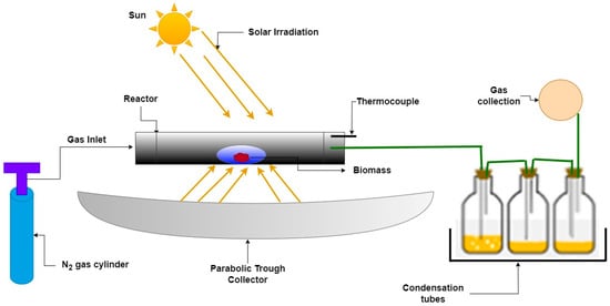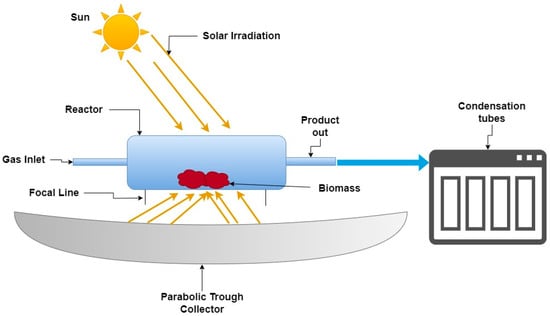 Sun-biomass pyrolysis refers to using sun energy for the thermal conversion of biomass into valuable bioenergy products [,]. In addition to providing an environmentally benign alternative to existing energy sources, solar energy and biomass pyrolysis address the world’s growing energy demands. Research and innovation in various fields have increased in response to the rising demand for clean and renewable energy sources []. In this regard, combining solar energy with biomass pyrolysis has shown to be a viable method of generating biofuels and renewable energy []. Utilizing solar energy from the sun’s limitless brightness is essential to pursuing clean and renewable energy. Photovoltaic cells and thermal–solar systems are examples of solar technologies that have advanced dramatically and now account for much of the world’s renewable energy capacity []. Solar energy is essential to pursuing a sustainable energy future as the focus on lowering carbon footprints and moving away from fossil fuels grows []. To generate heat, a collection of thermo-solar panels focuses and transfers solar radiation from a vast area into a smaller one [,]. Sun-biomass pyrolysis, the endothermic conversion of biomass in an inert atmosphere, is made possible by concentrated sun energy. The pyrolytic reactor receives direct solar insolation through a focused optical system, which converts biomass into valuable products at the desired temperature [,].