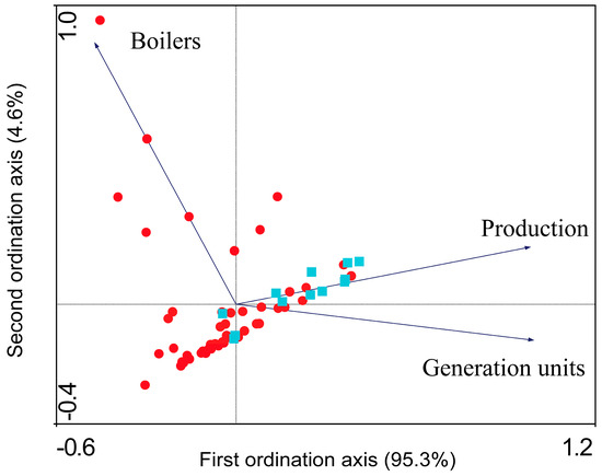 Biogas production and its utilization in power generation units were closely related, meaning that the more biogas produced, the more was used in the power generation units. These variables were strongly associated with the first ordination axis (scores of 0.981 and 0.993, respectively). Biogas utilization in power generation units increased after modernization, whereas biogas utilization in boilers decreased. Additionally, it was not dependent on the amount of biogas produced. This variable was associated with the second ordination axis (score of 0.874), which explained 4.6% of the data variability. The first ordination axis of the PCA explained 95.3% of the variability in the data describing biogas production and utilization (Figure 1).