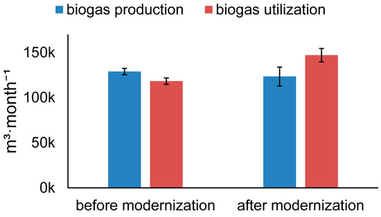 Biogas production and utilization before and after wastewater treatment process modernization (mean and SE, N = 60).