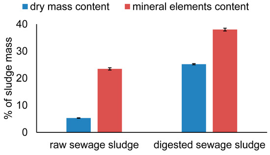 Recent advancements in sludge treatment focus on increasing efficiency, reducing environmental impact, and enhancing resource recovery [72]. Anaerobic digestion stabilizes sludge and produces biogas, while advanced thermal treatments convert sludge into biochar [73]. Addressing these limitations significantly enhanced the efficiency and sustainability of WWTPs, ensuring that they met the growing demands of modern society. Digested sludge showed a significantly higher dry mass content compared to raw sludge. Similarly, the mineral element content was substantially elevated in digested sewage sludge (Figure 3). These results indicated that the digestion process leads to a concentration of both dry mass and mineral elements in the sludge. Furthermore, robust monitoring systems for operational parameters such as temperature, pH, and retention time are important, but costly and technologically demanding.
