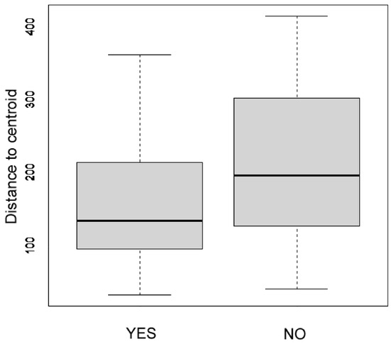 The vegan package in R was used to compute multivariate dispersion, which is based on the average distances of points from their group centroid in the space defined by the distance matrix. The formula for this dispersion is as follows [37,38]: