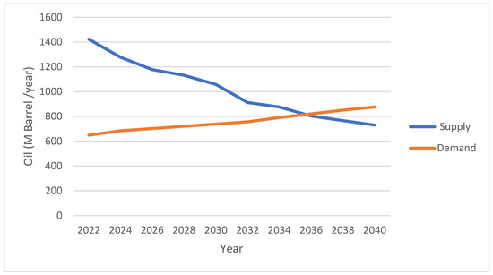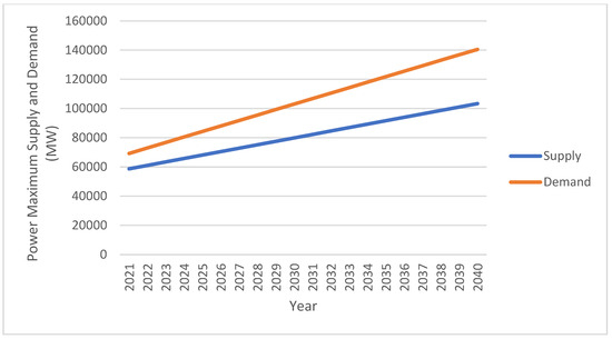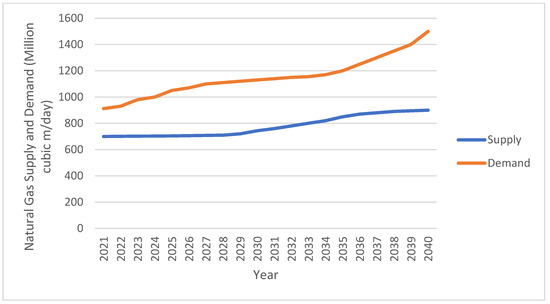 In 2023, Iran consumed an average of 249 billion cubic meters of natural gas, with 119 billion cubic meters allocated for residential and commercial use, 51 billion for major industries, and 79 billion for power generation [51]. By 2024, Iran ranked third in global natural gas production, with an output of 259 billion cubic meters, making up 6.4% of the global supply. It also produced 81,157,000 barrels of oil and gas condensates per day in 2023, positioning it as the eighth-largest global producer. However, the country is grappling with severe imbalances in its energy system, especially regarding natural gas. Its daily petroleum consumption exceeds 250 million liters, over six times the global average [52], with gasoline consumption reaching 140 million liters per day in 2024, a 13.5% increase from previous years. This has led to a daily deficit of 10 million liters. Similarly, the natural gas imbalance hit 350 million cubic meters in 2024 and is projected to escalate to 453 million and 600 million cubic meters by 2031 and 2040, respectively. The residential and commercial sectors remain the highest consumers, but inefficiencies and low productivity across the system are the root causes of these imbalances [52]. By 2040, the projected energy gap will include 2.4 million barrels per day for oil, 40,000 megawatts for electricity, and 512 million cubic meters per day for natural gas (Figure 1, Figure 2 and Figure 3), highlighting a widening divergence between production and consumption [17,50,51,52,53]. These projections were made by the author based on an analysis of historical consumption patterns, sector-specific demand trajectories, and current production capacities, assuming no significant technological or policy changes. The forecast accounts for the increasing demand in the residential, commercial, industrial, and power generation sectors, along with persistent inefficiencies and limited productivity improvements. As such, the author predicted Iran’s demand and supply of oil, gas, and power according to energy data without comprehensive reforms. These figures illustrate that the supply–demand imbalance will deepen by 2040, which will pose serious challenges to Iran’s energy security and sustainable development [17,50,51,52,53].