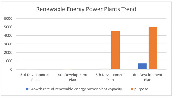 In recent years, numerous studies have been conducted on the need for renewable energy sources in both oil-dependent and non-oil-dependent countries. Some of these studies have examined the nature of opposition to renewable energy infrastructure projects and factors that could enhance public acceptance. Evidence suggests that issues related to ownership and community participation can improve acceptance within communities. Additionally, residents tend to have a more favorable view of renewable energy installations when these projects improve their quality of life through benefits such as increased local income, improved electricity access, and enhanced infrastructure [65,67,68,69]. The shift toward renewable energy production presents a major challenge in transitioning from fossil fuels and conventional technologies. Instead, reconfiguration has been recognized as a transition pathway, requiring both private and public sector engagement. The adoption of new technologies has primarily been driven by key private sector players, who have leveraged their existing capabilities, upgraded their expertise, and designed hybrid solutions that integrate new advancements with established knowledge to create innovative products. This challenge has prompted electricity companies worldwide to move toward renewable energy sources [63]. Energy transition policies aim to accelerate the shift to renewable energy, ensure energy security, reduce energy consumption, enhance energy efficiency, reduce greenhouse gas emissions, and foster economic growth. Achieving a balance between these objectives while addressing concerns from various stakeholders (including local communities, industry actors, and policymakers) requires careful planning and execution. Despite the targets set in Iran’s Sixth Development Plan, which is shown in Figure 5, which aimed for renewables to comprise 5% of the energy mix, their current share remains below 1%, indicating a long road ahead for renewable energy development.