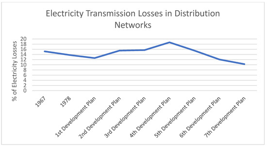 In the context of implementing good energy transition governance, optimizing energy consumption and maintaining balance in energy production and consumption is a fundamental challenge. Managing imbalances, increasing energy security, and sustainable development require the involvement of all stakeholders in power production from renewable sources [40,60,61,62,63,64]. The share of renewable energies in Iran’s energy production is neglected, as shown in Figure 4 and Figure 5. Also, the construction of more efficient power plants using oil and gas resources and high-efficiency distribution [65] is required. Figure 6 shows the losses in distribution networks in Iran that need to be reduced.