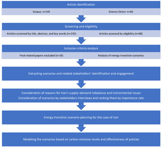 The contributions of this study are threefold. First, a thorough review of the literature indexed in Scopus and ScienceDirect under the keywords “sustainable development” and “energy transition” was conducted to identify prevailing policy instruments. Second, stakeholder engagement was emphasized in the selection of evaluation indicators from reviewing the indexed paper in the first step to reduce researcher bias. Third, this study modeled five future scenarios, unlike conventional single-scenario approaches, accounting for the complex dependencies between energy consumption and national development. The modeling included projections of energy supply and demand and CO2 emissions across four key sectors: electricity, heating, transportation, and industry.
