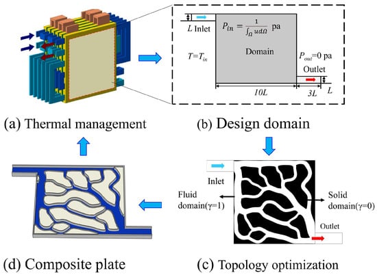 This study takes the phase change-liquid cooling coupling component of the battery thermal management system as the research object to carry out optimization of the design of the liquid cooling channel. The topology optimization design process is shown in Figure 1. All components are horizontally oriented, and then a thin wall is set between the phase change material and the liquid to prevent the PCM from flowing into the fluid channel. The heat generated by the battery is first absorbed by the phase change material. When the phase change material is completely melted, cooling fluid is introduced to instigate forced convective heat transfer cooling, keeping the phase change material in a solid–liquid two-phase state to maintain steady temperature. The density-based method has been widely applied to fluid topology optimization problems due to its computational efficiency and ease of numerical implementation throughout the iterative optimization process. Originating from the homogenization method, its core concept is to introduce a fictitious material element with variable density—an abstraction not found in actual engineering practice—based on the discretized modeling approach used in topology optimization. In the topology optimization process, the solid isotropic material with penalization (SIMP) method is adopted as the foundational framework. The design domain is discretized into finite elements, with each element assigned a design variable γ.