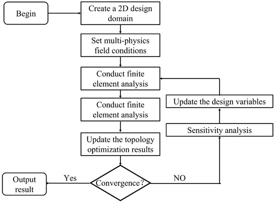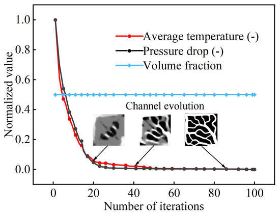 The finite element method is used to solve the flow and heat transfer equations to obtain velocity and temperature distributions. The sensitivity of the objective function can be solved using the adjoint method, and the spatial distribution of design variables is optimized and adjusted using sequential quadratic programming (SNOPT). Multiple iterations are performed until convergence to obtain a stable topological structure, as shown in Figure 2. This process was implemented using the finite element analysis software COMSOL Multiphysics 6.2, with the optimization tolerance set to 1 × 10−6. This parameter served as the primary convergence criterion for termination, meaning that the optimization was considered to have converged when the relative change in the objective function between two consecutive iterations was less than 1 × 10−6, indicating that a stable solution had been reached. Additionally, the maximum number of iterations was set to 100, and a relative tolerance of 1 × 10−3 was specified for each topology optimization iteration. This ensured that the solution for the physical fields after each design variable update had sufficient accuracy, thereby guaranteeing the reliability and stability of the optimization process.
