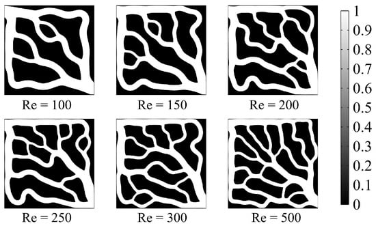 The parameters of the topology model are depicted in Table 1. Taking the volume fraction Vf = 0.5 as an example, the objective function during the iteration process and the channel evolution are shown in Figure 3. Topological channel structures with Reynolds numbers (Re) of 100, 150, 200, 250, 300, and 500 are generated, and the results are presented in Figure 4. As the Re increases, the liquid cooling channels exhibit more branches and finer flow paths, a structure that facilitates the homogenization of velocity and temperature distributions.