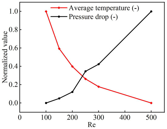 Figure 5 shows the average temperature and pressure drop of topological channels at different Reynolds numbers. With the lower Reynolds numbers, the average temperature of the liquid cooling plate decreases significantly, but after the Reynolds numbers exceed 300, the rate of average temperature decline becomes slower, indicating that the enhancement of the cooling plate’s heat dissipation performance tends to plateau at high Reynolds numbers. Although the higher Reynolds numbers yield a lower average component temperature, excessive branch flows result in higher flow resistance and increased pressure drop. Considering the comprehensive cooling performance and the practical challenges of modeling and numerical calculation, we selected the topological channel with a Reynolds number of 300 for subsequent numerical analysis in the following simulations, aiming to reduce computational costs while ensuring cooling efficiency.
