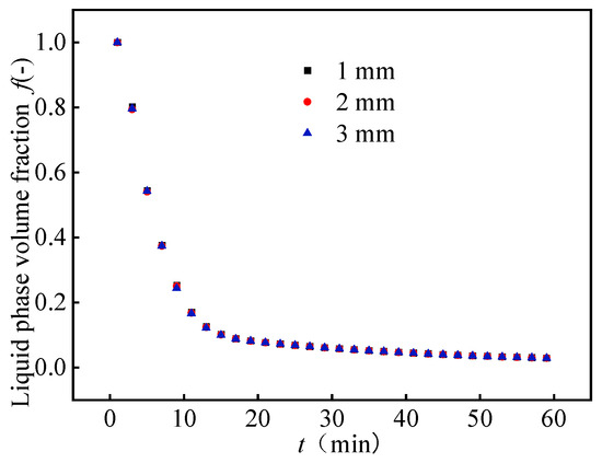 To ensure the reliability of the numerical simulations and determine an appropriate mesh size to improve the accuracy of numerical calculations, this paper conducts independent numerical calculation studies on the variations in the PCM liquid fraction with time using three types of meshes with mesh sizes of 1 mm, 2 mm, and 3 mm, respectively. The results are shown in Figure 7. During the phase change solidification process, the liquid fraction curves obtained under mesh sizes of 1 mm, 2 mm, and 3 mm almost overlap, indicating that the attenuation trend of the liquid fraction over time remains consistent across the different meshes. The errors in the liquid volume fractions at the same time nodes are all less than 1%, suggesting that the mesh size has a minor impact on the calculation results, i.e., the calculation has achieved grid independence. Therefore, to ensure the accuracy of numerical calculations and a reasonable calculation time, a mesh size of 2 mm is selected for subsequent numerical simulations, with the number of mesh elements being 517,954.