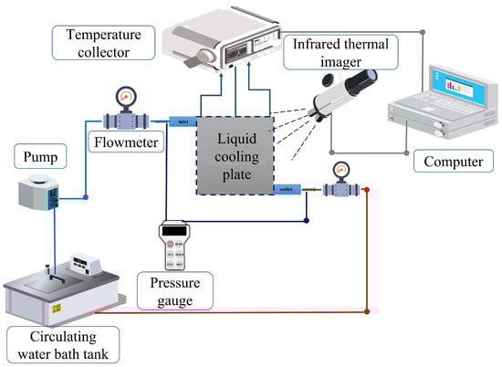 The experimental testing system is shown in Figure 8. A heating plate was tightly attached to the bottom of the liquid cooling plate using thermally conductive silicone to simulate the heat source. The temperature of the heating plate was regulated and stabilized by a precision temperature controller to ensure the consistency and controllability of the heat flux input during testing. As the coolant flowed through the liquid cooling plate, the coolant absorbed heat from the heating plate and was then discharged through the outlet, returning to a thermostatic water bath to complete the closed-loop cycle. A flowmeter was used to measure the flow rate and monitor real-time velocity. A YB-80A precision digital pressure gauge was connected at the inlet and outlet of the cooling plate to measure real-time pressure. A high-resolution infrared thermal imager (Guide-IPM384, 640 × 512 resolution, 12 μm pixel size, and thermal sensitivity ≤ 50 mK) was employed to capture non-contact temperature distribution images of the cooling plate surface, providing a visualization of the overall temperature field. Four K-type thermocouples (accuracy ±0.1 °C) were inserted into the temperature measurement holes of the cooling plate, then their readings were collected by a JK3000 24-channel temperature acquisition system (accuracy 0.5% ± 1 °C), which was connected to a computer for process control and data recording. A ball valve and a needle valve were used to perform coarse and fine adjustments of the flow rate, respectively. The coolant was driven from the thermostatic water bath to the PCM–liquid cooling system by a pump. Flexible PVC hoses were used for piping, and all pipelines were thermally insulated.