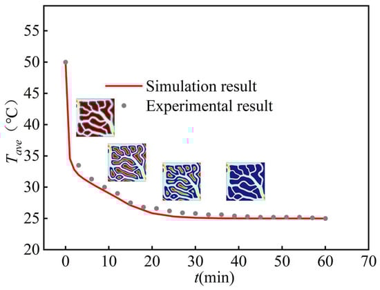 As shown in the simulated and experimental curves of the average temperature change recorded during the PCM solidification process depicted in Figure 9, the two curves exhibited a generally consistent trend, with an overall deviation of less than 1%, which falls within a reasonable range. This validates the accuracy of the numerical simulation results.