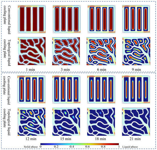 Figure 11 illustrates the time-dependent solid–liquid phase change interfaces of PCM during the solidification process in conventional and topological liquid cooling plates. Under identical cooling durations, the topology-optimized liquid cooling plate accelerates the phase transition from liquid to solid in PCM more effectively than the conventional design, demonstrating superior cooling performance. Upon coolant introduction, PCM solidification is initiated, with both configurations exhibiting the preferential solidification of PCM near the flow channels, forming a boundary with the liquid phase in the central region. As heat is dissipated, the liquid–solid interface propagates inward. The conventional liquid cooling plate’s regular channel geometry restricts coolant flow, concentrating heat transfer near the channels and resulting in weak central cooling and slow PCM solidification. In contrast, the topological design features a more uniform distribution of PCM regions and flow channels, promoting homogeneous coolant flow, increasing the heat transfer area, and significantly enhancing the solidification rates. This structure also ensures more uniform cooling and mitigates localized cooling deficiencies. As shown in the liquid-phase volume fraction plot in Figure 12, the PCM in the conventional plate achieves full solidification at 29 min, whereas the topological plate achieves complete solidification at 23 min—a 17.2% reduction in solidification time.