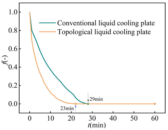 Figure 16c shows the variation curve of Tpcm, ave during the solidification process of PCM in the liquid cooling plates. Throughout the solidification process, the Tpcm, ave of the topology-optimized liquid cooling plate remains lower. The maximum difference in Tpcm, ave between the designs reaches 3.6 °C, with the topological design being approximately 12.3% lower. When Tpcm, ave in the liquid cooling plate stabilizes, this signifies the onset of the two-phase equilibrium region. The topology-optimized liquid cooling plate reaches the two-phase state at 32 min, which is 37.3% faster than the conventional cooling plate.