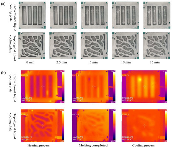 The phase change solidification processes of the phase-change liquid cooling plates with either conventional or topological channels are shown in Figure 13. When completely melted, the conventional liquid cooling plate exhibits a maximum temperature of 58.7 °C and an average temperature of 43.6 °C, while the topological liquid cooling plate shows values of 52.7 °C and 39.3 °C, respectively. The maximum temperature is 10.22% lower, and the average temperature is 9.86% lower for the topological design, which can be attributed to the enhanced thermal conductivity uniformity enabled by the dispersed configuration of topological channels. After 21 min of cooling, the average temperatures of the conventional and topological plates are 25.4 °C and 24.5 °C (a temperature difference of 3.5%), with maximum temperatures of 31.3 °C and 26.5 °C (a difference of 15.3%), respectively. The superior heat dissipation capability of the topological plate can be attributed to its complex channel configuration, increased heat exchange surface area, and uniform coolant flow distribution.