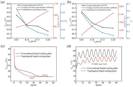 The comprehensive cooling performance of the liquid cooling plate. (a) The comprehensive cooling capacity index of the conventional liquid cooling plate; (b) the comprehensive cooling capacity index of the topological liquid cooling plate; (c) the average temperature of PCM; (d) the average temperature of the liquid cooling plate under fluctuating heat loads.