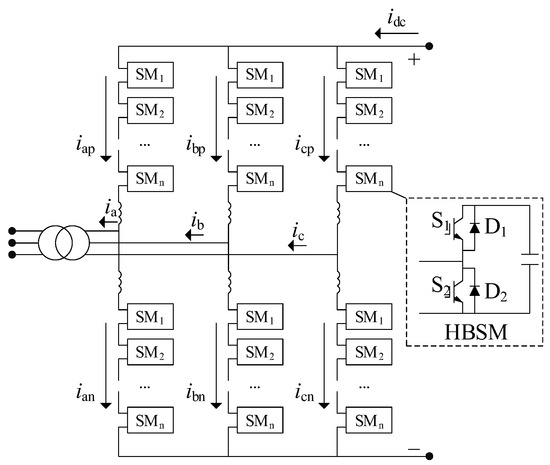 The Modular multilevel converter (MMC), featuring a self-commutation capability, modular design, elimination of device series connection, multilevel output, and low low-frequency harmonic content, has become one of the core equipment for high-voltage and large-capacity flexible DC transmission [3]. In recent years, China has commissioned multiple MMC-based flexible DC projects. In 2011, the Shanghai Nanhui Wind Farm Flexible DC Transmission Project—Asia’s first flexible DC transmission project—was successfully put into operation. The Luxi Back-to-Back DC Project followed in 2016, and both the Zhangbei DC Grid and the “Kunliulong” UHVDC Project were commissioned in 2020 [4,5,6]. Among China’s commissioned flexible DC projects, the maximum capacity of MMCs has reached 5000 MW.
