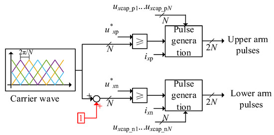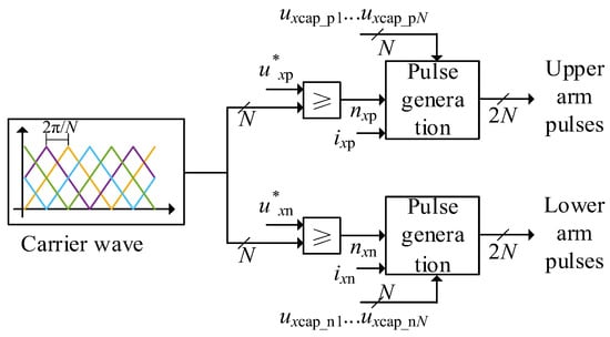 Figure 2 illustrates the basic principle of CPS modulation with four submodules, where N is the number of arm submodules, and are the reference voltages for the upper and lower arms of phase x, ixp and ixn are the arm currents, nxp and nxn are the number of inserted submodules in the upper and lower arms, and uxcap_p1…uxcap_pN and uxcap_n1…uxcap_nN are the capacitor voltages of the upper and lower arm submodules, respectively. The different colors are the different carrier wave. Triangular waves equal in number to the arm submodules are generated as carriers, with a phase shift of 2π/N between adjacent carriers. The upper and lower arm voltage reference waves are compared with the carriers, and the number of modulation waves exceeding the carriers determines the number of submodules to be inserted in each arm. Control pulses for switching devices are then calculated based on the number of inserted submodules, arm current direction, and capacitor voltage sorting.
