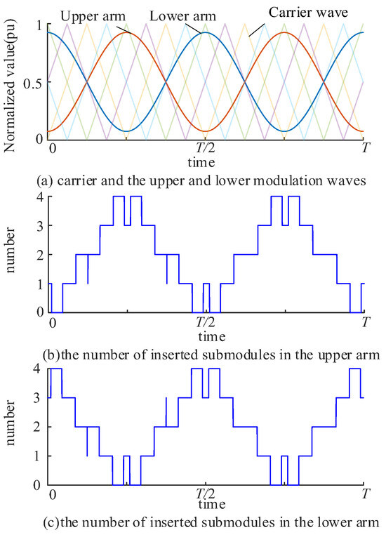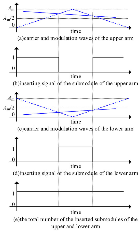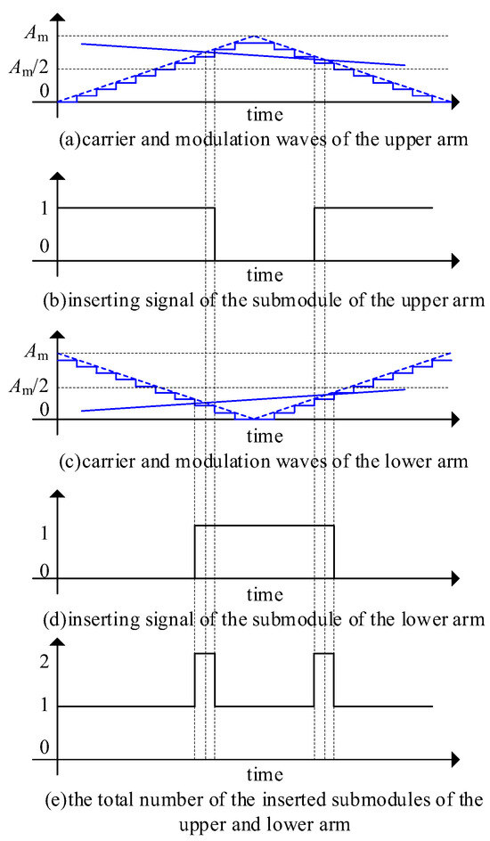 The ideal CPS modulation process and results are shown in Figure 3. Using CPS modulation, the upper and lower arms of the MMC output stepped Pulse Width Modulation (PWM) waves. Notably, under ideal CPS modulation, the number of inserted and bypassed submodules in the upper and lower arms are complementary—i.e., the sum of inserted submodules in the upper and lower arms always equals the number of arm submodules (four in this case). This phenomenon is explained in Figure 4, where Am is the maximum carrier amplitude: the upper and lower arm submodules (2N in total) can be viewed as N submodule pairs. For each pair, the carriers and modulation waves of the upper and lower arms are symmetric about Am/2 (Figure 4a,c), ensuring that bypassing a submodule in the upper arm coincides with inserting a submodule in the lower arm, and vice versa. Thus, only one submodule in each pair is inserted at any time, and the total number of inserted submodules in the upper and lower arms remains N. According to Equation (2), ideal CPS modulation does not generate high-frequency harmonics on the DC side.