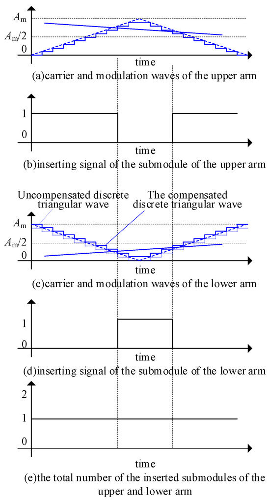 To address this, a discrete carrier compensation method based on amplitude symmetry is proposed, as shown in Figure 6. By adding a compensation level to the lower arm carrier, the upper and lower arm triangular waves become exactly complementary about Am/2. As shown in Figure 7c, compensating the lower arm carrier with “+1” delays submodule insertion and advances submodule bypass in the lower arm, ensuring simultaneous insertion/bypass of upper and lower arm submodules. Although there is still a slight timing error compared to the ideal triangular wave, this error does not induce DC harmonics, and the proposed method has no significant impact on AC harmonics—a conclusion verified by the simulation results in this paper.