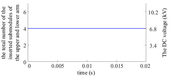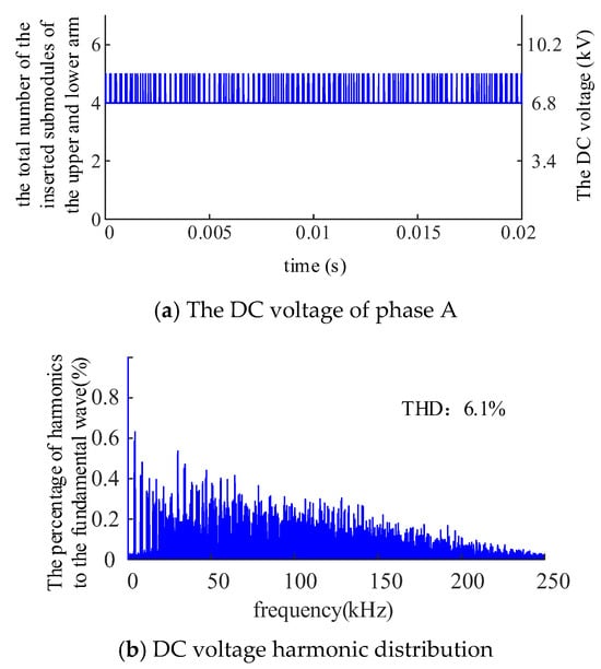 Based on this case, by adopting the discrete carrier compensation method proposed in this paper, the DC port voltage of the MMC can be obtained, as shown in Figure 9. Adopting the discrete carrier compensation method proposed in this paper can make the insertion and bypass of submodules in the upper and lower arms occur simultaneously, thus ensuring that the sum of the number of inserted submodules in the upper and lower arms is always equal to the number of arm submodules, and eliminating the DC high-frequency harmonics caused by carrier quantization errors.