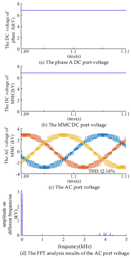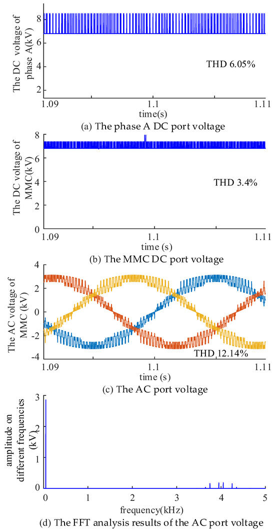 Simulation results using conventional CPS modulation are shown in Figure 10. Figure 10a depicts the phase A DC port voltage, where carrier quantization errors cause “early insertion and delayed bypass”, leading to frequent instances of five inserted submodules and significant high-frequency harmonics. FFT analysis of Figure 10a yields a THD of 6.05%, consistent with theoretical analysis. Figure 10b shows the MMC DC port voltage, where harmonics are partially canceled among phases but remain evident, with a THD of 3.4%. The AC port voltage in Figure 10c has a THD of 12.14% under this modulation strategy. Figure 10d presents the FFT analysis results of the AC port voltage, indicating that the harmonics are clustered around 4 kHz.