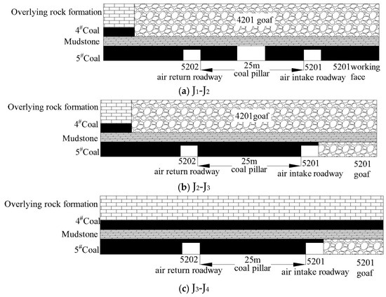 Among them, the upper part of the 5202 air return roadway (mileage: 0~990 m (J1-J3)) comprises the 4201 goaf of the 4# coal seam; the section at 990~1663 m (J3-J4) is the solid coal area of the 4# coal seam. According to the plans, it is necessary to construct the 5202 working face roadway during the mining of the 5201 working face. For this reason, the 5202 air return roadway will experience four mining conditions during the excavation process: ① J1-J2: as shown in Figure 2a, this is driven under the 4201 goaf along the solid coal seam of the 5201 working face; ② J2-J3: as shown in Figure 2b, this is driven under the 4201 goaf along the goaf of the 5201 working face; ③ J3-J4: as shown in Figure 2c, this is driven under the solid coal of seam 4 along the goaf of the 5201 working face; ④ J4-J5: as shown in Figure 2d, this is driven under the solid coal of seam 4 along the solid coal of Seam 5. Among these, J1 is the opening position of the roadway, J2 is the convergence position of the mining and digging working faces, J3 is the open–off cut of the 4201 working face of the 4# coal seam, J4 is the open–off cut of the 5201 working face, and J5 is the open–off cut of the 5202 working face.