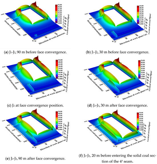 The vertical stress field distribution of the rock surrounding the mining and digging working faces is shown at different times in Figure 4. It can be seen that the 5202 air-return roadway is influenced by the mining of the adjacent 5201 working face and the adjacent goaf lateral abutment stress. Additionally, the stress of the roadway-side goaf is clearly higher than that of the side of solid coal, and the stress under the solid coal of the 4# coal seam is higher than that under the goaf, especially near the junction of the two, where the stress concentration is the most obvious. We then analyzed the evolution patterns of vertical stress in the rock surrounding the roadway in two sections: before and after the convergence of the mining and excavation faces, and before and after entering the solid coal of Seam 4.
