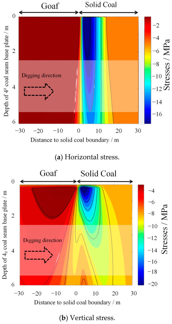 Each parameter is substituted into Equations (7) and (8) and calculated using numerical calculation software to obtain the stress distribution maps at different depths of the solid coal bottom plate, as shown in Figure 8. The results show that vertical, horizontal, and shear stresses will be concentrated under the solid; for example, in the area where the roadway is located, namely in the top plate, the peak vertical stress is about 12 MPa, and the peak stress is about 10 m away from the edge of the solid coal (point J3). Additionally, as we move away from the edge of the solid coal, the degree of concentration of the stress under the solid coal decreases gradually; and it is basically unaffected by the solid coal and restores to the original rock stress levels after 20 m. The stress concentration under the solid coal gradually decreases as we move away from the edge of the solid coal. In addition, the vertical stress is about 5 MPa on the side of the goaf adjacent to point J3, forming a stress reduction zone.