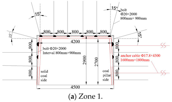 This zone is influenced by the concentrated load of solid coal on the outer side of the overlying goaf, which means the support needs to be strengthened. The roof is reinforced with cable anchors of φ17.8 mm × 7300 mm, installed at a spacing of 1600 mm × 1800 mm (transverse × longitudinal) in a 3-3-3 arrangement, and both ribs are reinforced with short cable anchors (φ17.8 mm × 4300 mm), installed in pairs per row at a spacing of 1600 mm × 1800 mm (transverse × longitudinal), as shown in Figure 10c.