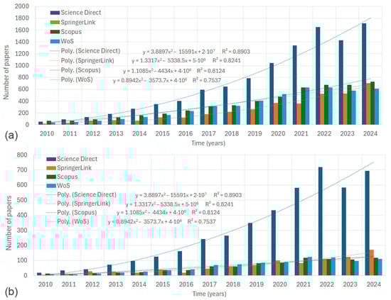 According to results from the review of scientometric databases, data of which are shown in Figure 1a, the term “biomethane” began to be visible in scientific literature starting in 2010. Previously, it appeared rarely. In the following years, the number of publications containing this term grew gradually until 2022. The greatest increase in interest in the issue of biomethane took place in the second decade of the 21st century. This issue is still at the center of research interests, although in 2024 the increase in the number of papers was not significant compared to 2022, when the highest number was noted. The average number of papers published per year in the period 2021–2024 is 2–3 times higher (depending on the database) than in the period 2011–2020.