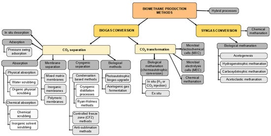 The raw material for biomethane production is biomass of various characteristics and origins, including organic waste and by-products, such as animal manure, energy crops, agricultural residues, food waste, sewage sludge, forest residues, and industrial organic residues [64]. However, the way of producing biomethane may vary significantly. It can be based on biological or thermochemical transformations, as a result of which biomass (dry or with various degrees of hydration) is converted into gaseous products, which in turn are further processed to obtain a product consisting mainly of methane. A schematic overview of biomethane production methods is presented in Figure 2.