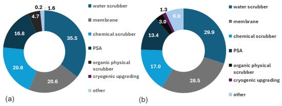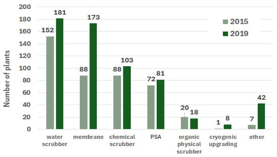 As can be seen from the data presented in Figure 4, the water scrubber technology holds the largest global market share (ca. 30%), while the membrane technology has been gaining popularity in recent years (ca. 29%).
