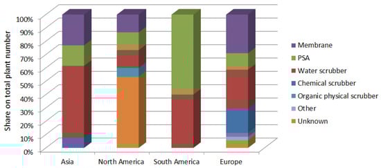 Share of biogas upgrading technologies on particular continents on the basis of IEA Task 37 data [198].