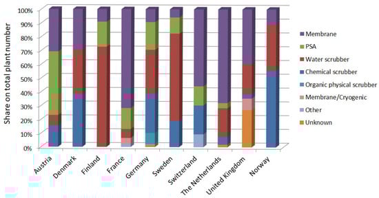 Taking into account the data collected by IEA Task 37 [198], which are presented graphically in Figure 5, the uneven dissemination of different types of biogas upgrading technology in a geographical perspective on a global scale can be noticed. The greatest diversity of technologies occurs in Europe, but a large variation in the share of particular technologies in individual countries is also observed in this region (Figure 6).