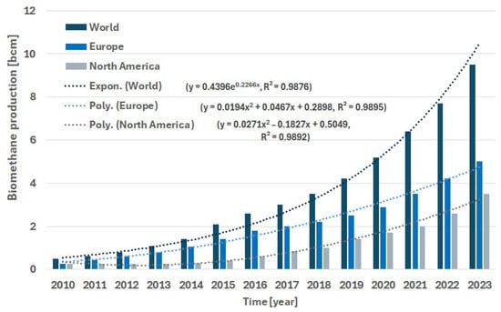 The use of biogas by processing it into a more calorific product has been practiced for about 30 years. In a 1998 report on clean energy sources in transport, Mansson mentioned biomethane produced from biogas as a source of energy in transport, gave the conditions for its use as a transport fuel, and cited the results of tests with biogas-powered buses conducted in Sweden [11]. However, biomethane is still a negligible source of energy on a world scale. Global primary energy consumption in 2023 was estimated at ca. 165,000 TWh, in which natural gas provides over 40,100 TWh [12], i.e., ca. 24%. At that time, the estimated global biomethane production was about 100 TWh (estimated on the basis of CEDIGAZ [13] data on biomethane production in 2023, which was 9.5 bcm). Thus, biomethane represented only 0.25% of global gas demand in 2023.