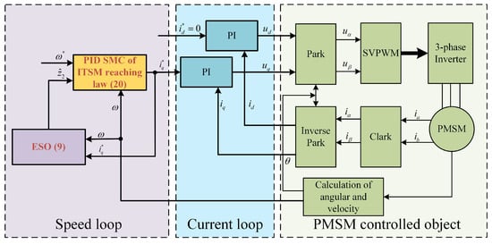 Figure 1 illustrates the proposed control scheme for the PMSM system. The whole control block diagram includes three parts, which are the speed loop controller, current loop controller and PMSM controlled-object. In the speed loop, firstly, the ITSMRL is proposed. Then, the ESO is developed with the purpose of estimating the total lumped disturbance. Finally, the observed lumped disturbance is fed forward; based on this, a composite sliding mode control method based on the ITSMRL is designed.