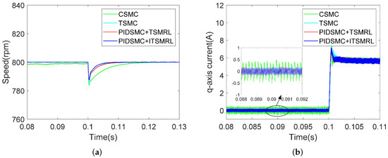 In the loading experiments, a sudden load torque disturbance was added when the PMSM was running at the speed of . The response curves for speed and under different controllers are shown in Figure 9a,b, Figure 10a,b, Figure 11a,b and Figure 12a,b. The quantitative comparison values are shown in Table 6. It can be seen that the smallest speed fluctuation and smallest chattering occurred under the proposed method compared to PIDSMC+TSMRL, TSMC and CSMC when loading, as shown in Table 6. Due to the use of the ITSMRL, the proposed method showed reduced chattering and strong robustness.