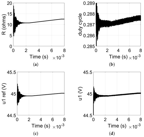 The simulation results are presented in Figure 12. Figure 12a shows the curve of the estimated load resistance, which exhibits an increasing trend from 10.7 to 12.5 . However, exhibits an error of approximately 1.5 during the steady state, which does not significantly impact the control performance. In Figure 12b, the modulation index for controlling the switches shows a minimal increase, but it is sufficient to adjust the voltage . As shown in Figure 12c,d, both and exhibit equivalent and ascending behavior.