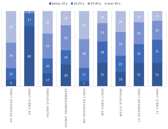 Figure 2, one can speak of an ageing network infrastructure. The greatest degree of wear and tear is characterised by 110 kV and MV overhead lines. Less than 80 per cent of these lines were built more than 25 years ago and since then, due to legal obstacles and a lack of resources (mainly financial), they have largely not been upgraded and have only undergone the required repairs and inspections. The age of less than 25 years is characterised only by HV, MV and LV cable lines. All energy groups have implemented or are planning major investments to replace overhead lines with cable lines. The extent of these investments will depend on financial outlays, commitments and also regulatory rules.