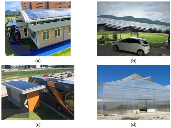 Building roof is a regular place to install PV panels. It has been proved that under certain circumstances, roof-top PV has the potential to cover the building’s energy consumption [35]. Data about roof-top PV applied in European countries is summarized in Table 2 [31]. These installations contribute significantly to the shift toward renewable energy, as highlighted by a study that evaluated 32,744 roof-top PV systems across European countries from 2012 to 2019. The study found specific yield variations and performance trends that correspond to geographical differences and installation conditions. Specifically, the average specific yield over this period showed a south-north gradient, with countries like Italy achieving the highest yields due to favorable climatic conditions, reaching up to 1246 kWh/kWp in some years. Table 2 illustrates these regional differences, with Italy having an upper specific yield limit of 1800 kWh/kWp compared to 1500 kWh/kWp in northern countries like the Netherlands, Belgium, and Luxembourg. However, it is important to note that in non-temperate regions, PV yields may not follow the same patterns as in temperate regions [36]. For instance, in tropical regions, although the area receives longer sunlight hours, PV systems are theoretically expected to generate higher yields. However, due to the high temperature and high humidity conditions, the efficiency of PV systems is often significantly impacted. High temperatures can cause the PV panels to overheat, thereby reducing their conversion efficiency. Additionally, the higher humidity can lead to water accumulation and mold growth on the panels, increasing the difficulty of cleaning and maintenance, which in turn affects the system’s long-term performance. Moreover, the intense UV radiation and frequent rainfall in tropical regions may accelerate the degradation of PV systems, shortening their lifespan. Therefore, PV systems in tropical regions usually yield less than those in temperate regions. On the other hand, PV systems in desert regions face different challenges. Although desert areas have abundant solar resources, which theoretically should result in higher PV system output, extreme UV radiation and sandstorms can negatively impact system efficiency. The intensity of UV radiation can accelerate the aging of PV materials, reducing the long-term stability and power output of PV cells. Furthermore, the accumulation of sand not only obstructs sunlight from reaching the PV panels, reducing their energy intake but also increases the cleaning and maintenance costs, as regular cleaning is necessary to maintain system efficiency. In desert areas, especially in dry environments, the impact of sand on the PV panels is particularly severe, leading to more frequent cleaning cycles and higher maintenance costs, which present a significant challenge for improving the long-term benefits of PV systems and reducing overall operational costs. Therefore, for PV systems in different climatic zones, the design should not only consider the sunlight hours but also take into account factors such as temperature, humidity, UV radiation, and sand accumulation to ensure the maximum effectiveness of the system in various regions. Additionally, combining roof-top PV systems with battery storage has shown improved performance consistency, as observed in Germany and Belgium [31]. As shown in Figure 1 [33], the blue arrow represents the PV panels, and the red arrow indicates the residential roof. In Figure 1a, the PV panels are independently installed on top of the roof without altering the original building materials. In Figure 1b, the PV panels replace part of the roof and integrate with it, becoming a part of the roofing material. Roof-top PV can be applied to office buildings, residential buildings, and some functional buildings, as shown in Figure 2 [37,38]. The roof-top PV systems were usually combined with battery storage systems in buildings [30,39].