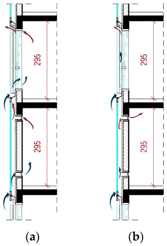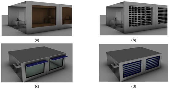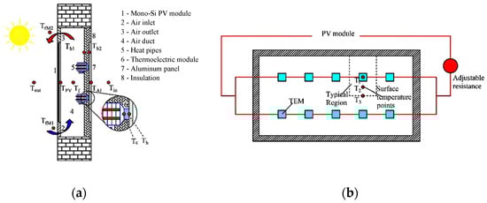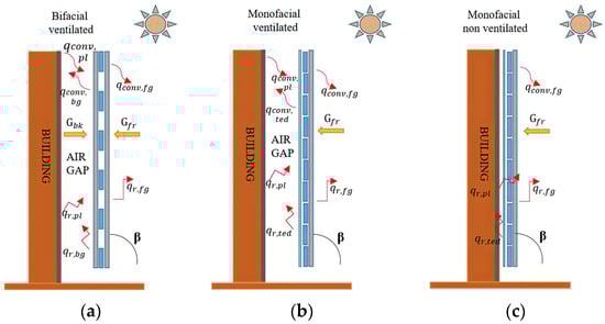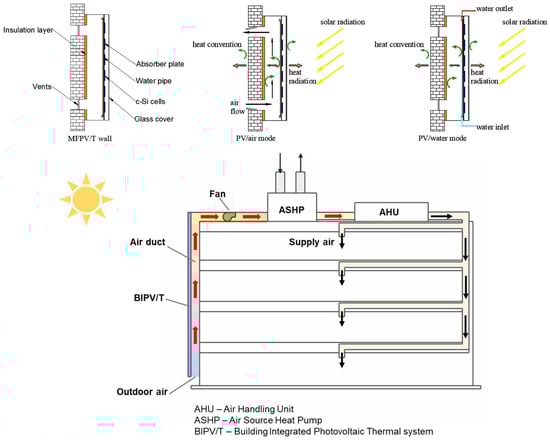 PV panels that are integrated with walls or opaque façades of a building can be referred to in Figure 3 [46,47]. Studies were carried out about system configurations and installations to increase energy yields. Four configurations, namely non-ventilated and ventilated façade combined with mono facial panels, ventilated active façade combined with the bifacial panel, and the bifacial panel added with a reflective surface on the rear side, as shown in Figure 4, were analyzed [48]. Power generation and internal rate of return (IRR) can be increased by up to 19% and 6%, respectively, if the PV panels are installed in south facades [49]. Some novel configurations were proposed to improve the performance. Y.Q. Luo et al. [50] proposed a new compound building envelope system, the walls of which were integrated with PV panels, thermoelectric modules, and battery systems, as shown in Figure 5. The system achieved 72 to 92% energy savings in cold regions, 88 to 100% in mixed zones, and 100% in cooling-dominant zones compared to a reference wall. C. Theokli et al. [47] proposed a ‘corridor type’ double façade PV system with ventilation, the operating methods of which are shown in Figure 6.