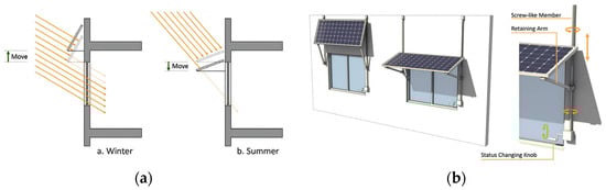 PV panels can be combined with windows in many ways. N. Skandalos et al. [46] investigated the performance of four types of PV windows, namely semi-transparent PV with a-Si/c-Si solar cells, PV overhang, and PV louvers, which can be referred to Figure 7 [46]. The solar cells of semi-transparent PV windows are different, which can be a-Si solar cells or c-Si solar cells [46]. The performance of semi-transparent PV windows depends on window orientation, thermal properties of windows, and PV cell coverage ratio [51,52]. The building’s cooling load can be influenced by the utilization of PV windows. As compared with normal glass windows, a study reported a 9.16% and 63.71% reduction in cooling energy consumption for the application of PV windows in Phoenix, US [53]. The PVSYST software [54] analyzed optimal PV window orientation to reduce cooling load and boost energy production. Using PV windows can reduce annual air conditioning consumption by 27.69% in hot, dry, and humid regions. Besides, indoor thermal comfort is also influenced by PV windows [52,55,56]. PV can also be used as sunshades of windows, in the form of overhangs or louvers, as shown in Figure 7c,d [46]. M.A. Paydar proposed a movable PV-shading system installed over the windows, the optimal conditions of which were determined for each month, as shown in Figure 8 [57].