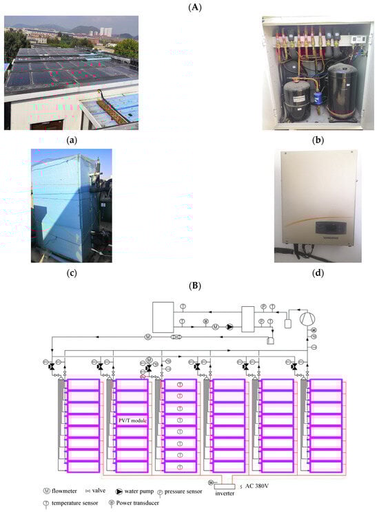 The photovoltaic-thermal (PV/T) system has the function of generating both power and thermal energy, increasing PV efficiency per unit solar radiation area [58]. PV/T systems can be integrated with roofs [45,58,59,60] and façade [47,52,61,62,63] of a building, which are shown in Figure 9 and Figure 10. In the study of Z.M. Li et al. [60], two PV/T systems were investigated, PV cells which were laminated on an absorbing plate and on the back of a glass cover, respectively. The heat produced by PV/T is collected by flow fluids. The air heated by the PV module was supplied to the interlayer of roofs, as shown in Figure 10 [22,61], where it was heated by an air source heat pump and sent into the occupant’s room for heating. In addition to using the heat directly for heating, the heat can be stored in a storage tank, as shown in Figure 11 [56]. Water [59,61] or other working fluid [18,57] flows in the pipes, which are installed in the PV panels, to collect the generated heat, and release the heat to the storage tank [58], as shown in Figure 9. Hot water can be supplied to occupants [64].