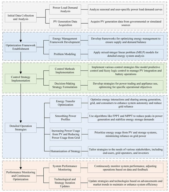 This review follows a progressive logic of “foundational analysis→system integration→ dynamic optimization→summary and outlook” to construct a multi-level research framework: First, at the foundational layer (Section 2 and Section 3), by analyzing the technical potential of photovoltaic (PV) power generation—such as the efficiency of Building-Integrated Photovoltaics (BIPV) and temperature effects—and the complementary characteristics of energy storage systems (ESS) (e.g., battery lifespan and hydrogen-based long-duration energy storage), the boundaries of their standalone performance and the necessity for synergy are clarified. Second, at the integration layer (Section 4), a PV-ESS collaborative configuration method is proposed. A multi-objective optimization model balances economic costs—including the Levelized Cost of Energy (LCOE) and Net Present Value (NPV)—with environmental goals (carbon emission reduction), achieving system-level design. Subsequently, at the optimization layer (Section 5), the framework extends from static design to dynamic operation. Intelligent strategies such as time-of-use electricity price response and Vehicle-to-Grid (V2G) technology are employed to enhance system flexibility. Finally, at the summary and outlook layer (Section 6), the review summarizes key research findings on the integration and optimization of PV systems and ESS in buildings and highlights its contributions to interdisciplinary research directions (e.g., Artificial Intelligence (AI)-driven forecasting and retired battery reuse).