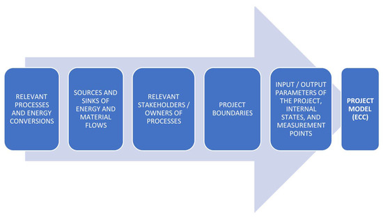 Within the defined boundaries of the project, the energy field is integrated into process flow diagrams, which form the basis for decisions on the establishment of ECCs, the fundamental elements of the entire sustainable energy project model. At the conceptual level, the ECC-based approach falls into the family of integrated process planning or process synthesis methods [20]. Due to its simplicity and successful use in numerous industrial applications worldwide, pinch analysis is the most commonly used methodology for integrated process planning [21,22]. According to [20], an ECC can be any department, part of a department, or machine that converts large amounts of energy or creates significant environmental impacts. With the ECC structure, material and energy flows through the production process under consideration, their basic conversions, and input–output connections with the environment can be schematically represented. The ECC model structure is defined by a set of signals determined for each system segment. Modelling and process integration based on ECCs are often used to improve production control, explore flexibility, and record current operational conditions [20]. The ECC structure can also be used to identify environmental impacts from individual parts of the production process where various energy sources are used. The goal of designing sustainable energy projects is also to have a positive impact on the economic and social standing of people in the local community while simultaneously reducing negative environmental impacts. Therefore, the ECC structure can also include social and sociological impacts of the sustainable energy project. If, for a given ECC, the input energy is defined as the sum of all incoming energy carriers (, material inflows ( output energy (, and material production outputs (), various performance indicators can be derived. For example, energy efficiency can be expressed as: